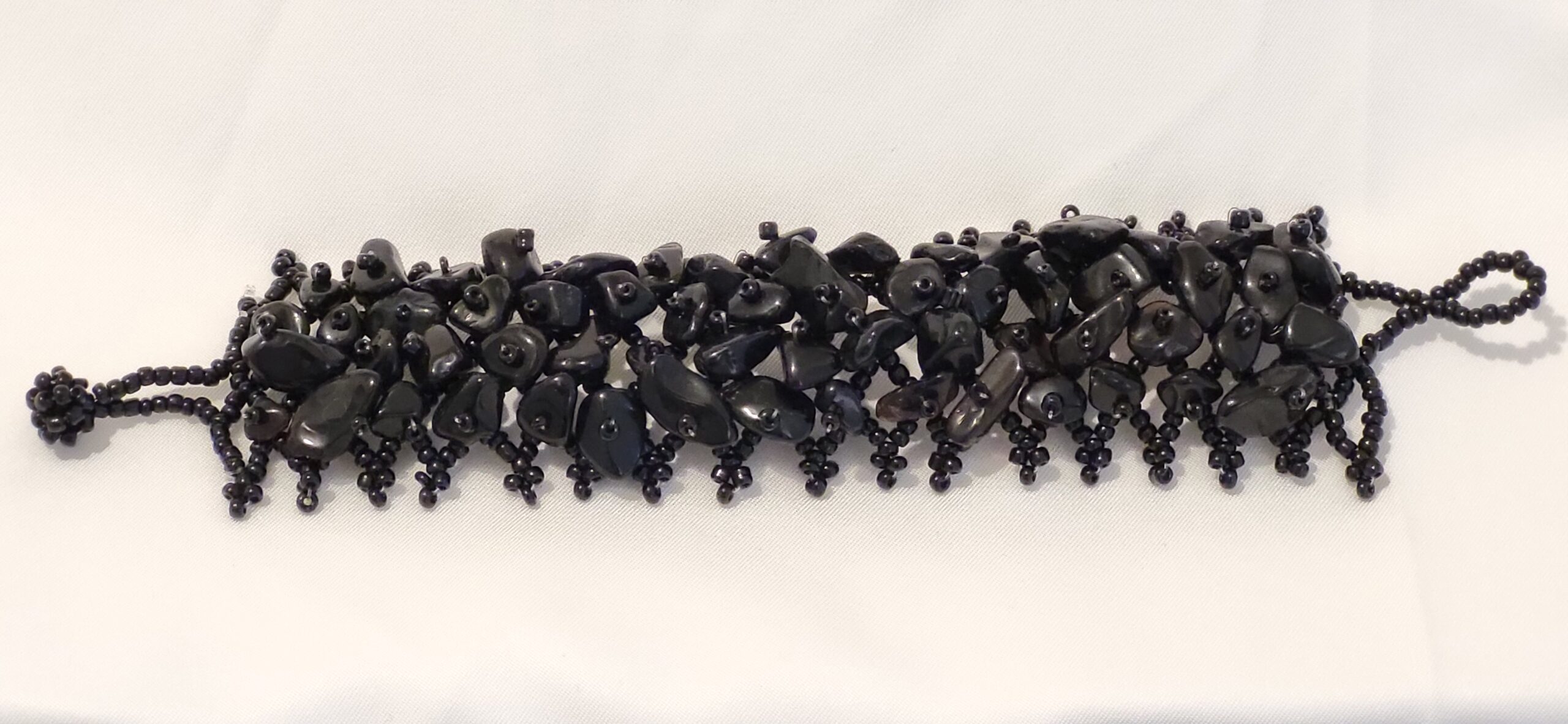 Black Obsidian gemstone chips paired with sparkling 3x4mm crystal rondelle beads. Each bracelet is carefully assembled to create a harmonious balance between earthy grounding and radiant elegance.